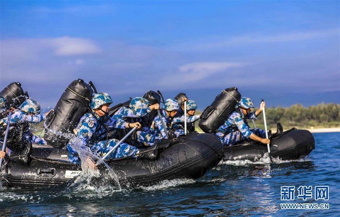 海軍陸戰(zhàn)隊(duì)某旅偵察營在三亞某海域開展劃舟訓(xùn)練(11月20日攝)。新華社發(fā)(范旭東 攝)