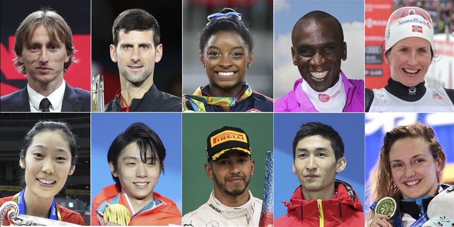 拼版照片上排從左至右為:盧卡·莫德里奇、諾瓦克·焦科維奇、西蒙·拜爾斯、埃魯?shù)隆せ諉谈瘛⒈燃s根;下排從左至右為:朱婷、羽生結(jié)弦、劉易斯·漢密爾頓、武大靖、霍蘇。 新華社發(fā)