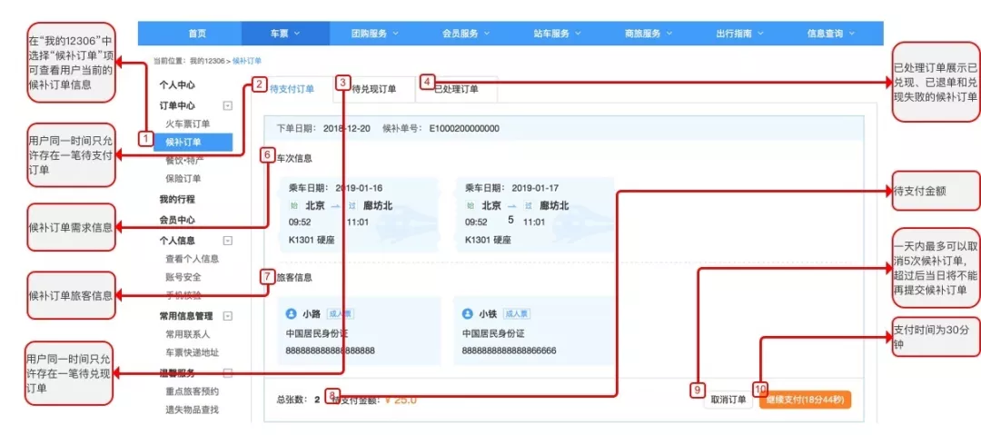 手機APP示意圖 候補訂單提交成功后需在30分鐘內(nèi)完成支付,完成候補預付款支付后,候補購票訂單立即生效。候補購票訂單生效后,相關(guān)候補需求不可修改,如需變更,可終止訂單后重新操作。兌現(xiàn)時,按照候補訂單生效的時間順序,兌現(xiàn)符合條件的候補需求。預付款按該單不同組合需求中票款的最高額度計算(臥鋪按下鋪票價計算)。 候補購票預付款支付成功后,系統(tǒng)將持續(xù)嘗試為您兌現(xiàn)候補需求(同一候補需求不進行部分兌現(xiàn)),若有匹配需求的車票,系統(tǒng)將自動為您生成已支付訂單,預付款大于實際票款的,系統(tǒng)將自動退回差額票款;若無匹配需求的車票,系統(tǒng)將在截止兌現(xiàn)時間自動終止兌現(xiàn),用戶主動終止或系統(tǒng)自動終止候補的,系統(tǒng)自動全額退還預付款。 兌現(xiàn)成功或自動終止時,將通過您選擇的通知方式進行告知,請注意查收消息并關(guān)注“候補訂單”兌現(xiàn)狀態(tài)。兌現(xiàn)成功車票視為已購車票,退改簽按既有規(guī)則辦理。 劃重點 候補訂單提交成功后 需要在30分鐘內(nèi)完成支付 預付款按組合需求中票款最高額度計算 系統(tǒng)自動退回差額票款 登錄12306.cn網(wǎng)站,在個人中心導航欄上點擊“候補訂單”可進入訂單查看頁,候補訂單分為“待支付訂單”、“待兌現(xiàn)訂單”和“已處理訂單”三個選項,其中“已處理訂單”包含已兌現(xiàn)、已退單和兌現(xiàn)失敗三種狀態(tài)訂單,已兌現(xiàn)表示候補需求兌現(xiàn)成功;已退單表示用戶主動退單;兌現(xiàn)失敗表示候補需求兌現(xiàn)失敗,可能為車票數(shù)量不足、與實名制規(guī)定沖突等原因。