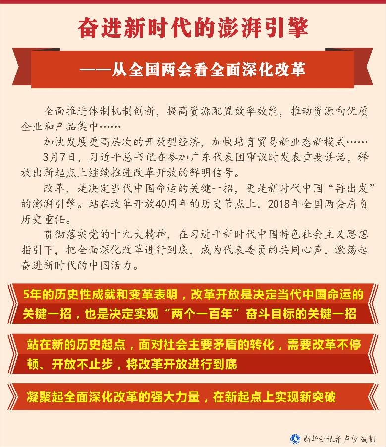 貫徹落實(shí)黨的十九大精神,在習(xí)近平新時代中國特色社會主義思想指引下,把全面深化改革進(jìn)行到底,成為代表委員的共同心聲,激蕩起奮進(jìn)新時代的中國活力。
