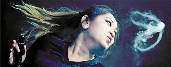 圖為2017年在俄羅斯莫斯科市舉行的專業(yè)電子煙產(chǎn)業(yè)展銷會。玩家正手持電子煙吐煙圈。新華社資料照片