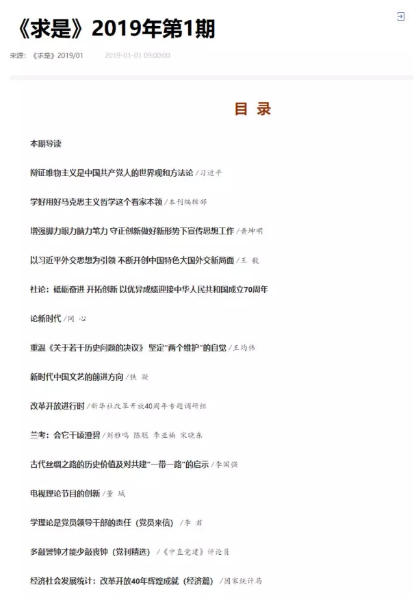 中共中央機(jī)關(guān)刊《求是》雜志從2019年1月1日出版的第1期起全新改版。這是黨中央進(jìn)一步加強(qiáng)全黨思想理論建設(shè),堅(jiān)持用習(xí)近平新時(shí)代中國特色社會(huì)主義思想武裝全黨、教育人民、指導(dǎo)實(shí)踐的重大舉措,體現(xiàn)了以習(xí)近平同志為核心的黨中央,對(duì)發(fā)揮好黨中央主辦的理論刊物指導(dǎo)全黨全國工作重要思想理論陣地作用的高度重視。