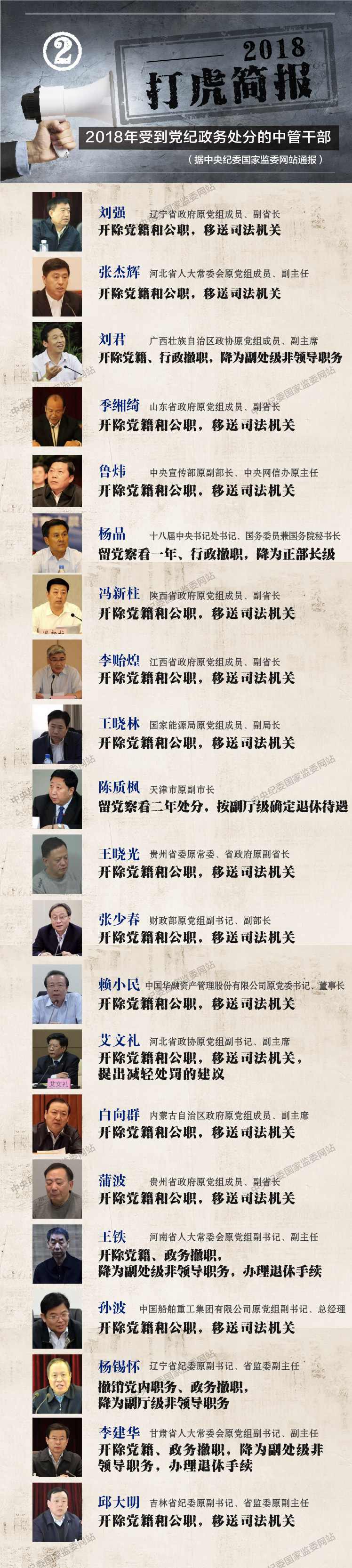 ——嚴(yán)重違紀(jì)、嚴(yán)重觸犯刑律的黨員必須開除黨籍;涉及嚴(yán)重違法犯罪,必須移送司法機關(guān)。2018年公布處理結(jié)果的21名中管干部里,18人被開除黨籍,15人被移送檢察機關(guān)審查起訴。