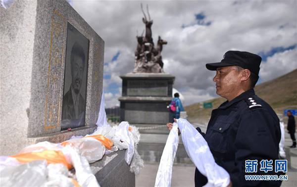 索南達(dá)杰的侄子秋培扎西向索南達(dá)杰烈士紀(jì)念碑敬獻(xiàn)哈達(dá)(2018年8月10日攝)。 新華社記者 吳剛 攝