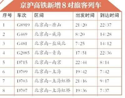 記者從北京鐵路局獲悉,調(diào)圖后,京滬高鐵將增加8對(duì)旅客列車,分別為北京南至唐山、威海、鹽城北、青島、南京、上海各1對(duì),至上海虹橋動(dòng)車組2對(duì)。