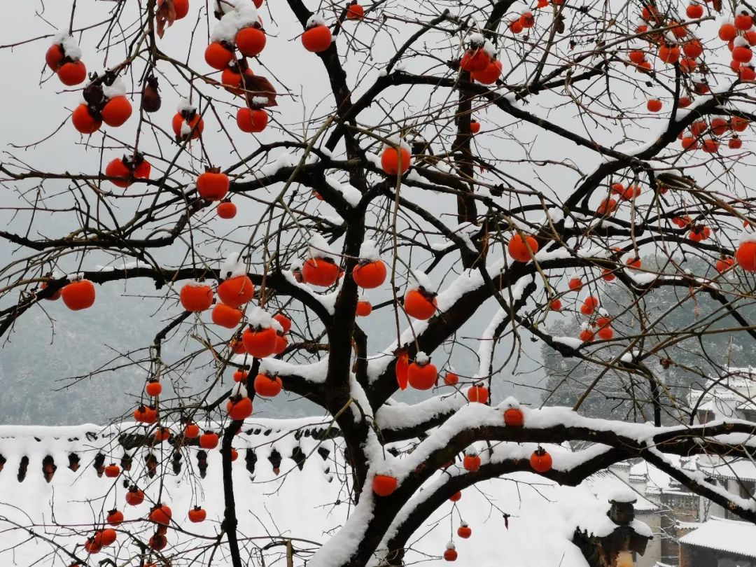 2018-12-31,江西婺源。在中國最美鄉(xiāng)村婺源,古村落篁嶺喜降瑞雪,滿樹的柿子如一個個小燈籠,紅紅火火,喜迎新年。作者:董立新