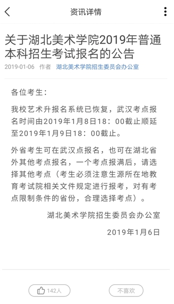 1月6日,湖北美術(shù)學院發(fā)布的報名時間順延通告。