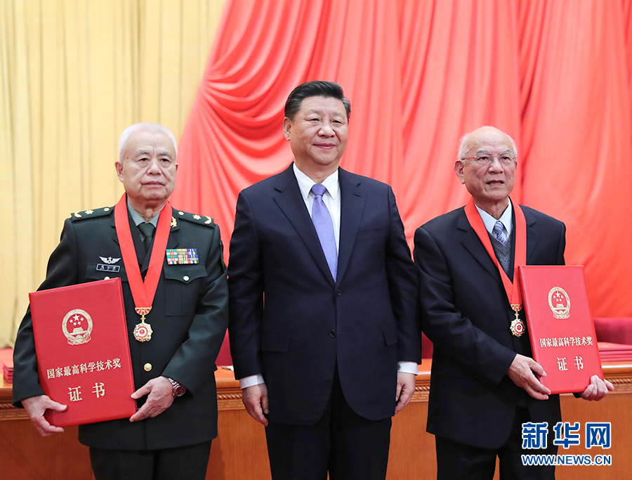 1月8日,2018年度國家科學(xué)技術(shù)獎勵大會在北京人民大會堂隆重舉行。中共中央總書記、國家主席、中央軍委主席習(xí)近平向獲得2018年度國家最高科學(xué)技術(shù)獎的哈爾濱工業(yè)大學(xué)劉永坦院士(右)和中國人民解放軍陸軍工程大學(xué)錢七虎院士(左)頒獎。 新華社記者 謝環(huán)馳 攝