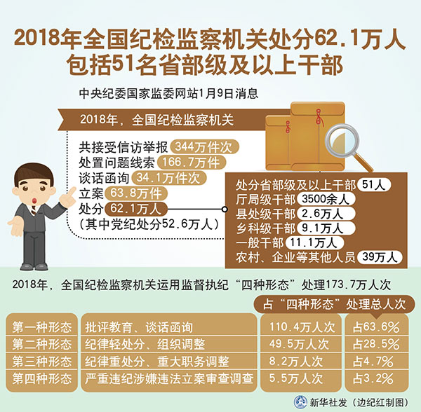 2018年,全國(guó)紀(jì)檢監(jiān)察機(jī)關(guān)共接受信訪舉報(bào)344萬(wàn)件次,處置問題線索166.7萬(wàn)件,談話函詢34.1萬(wàn)件次,立案63.8萬(wàn)件,處分62.1萬(wàn)人(其中黨紀(jì)處分52.6萬(wàn)人)。處分省部級(jí)及以上干部51人,廳局級(jí)干部3500余人,縣處級(jí)干部2.6萬(wàn)人,鄉(xiāng)科級(jí)干部9.1萬(wàn)人,一般干部11.1萬(wàn)人,農(nóng)村、企業(yè)等其他人員39萬(wàn)人。