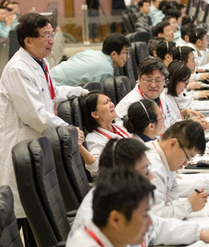 1月3日,嫦娥四號(hào)落月的一刻,74歲的中國航天科技集團(tuán)五院深空探測和空間科學(xué)首席科學(xué)家、嫦娥一號(hào)衛(wèi)星總設(shè)計(jì)師葉培建院士走向正在前排工作席的嫦娥四號(hào)探測器項(xiàng)目執(zhí)行總監(jiān)張熇,兩代“嫦娥人”的手,緊緊地握在了一起。新華社記者金立旺攝