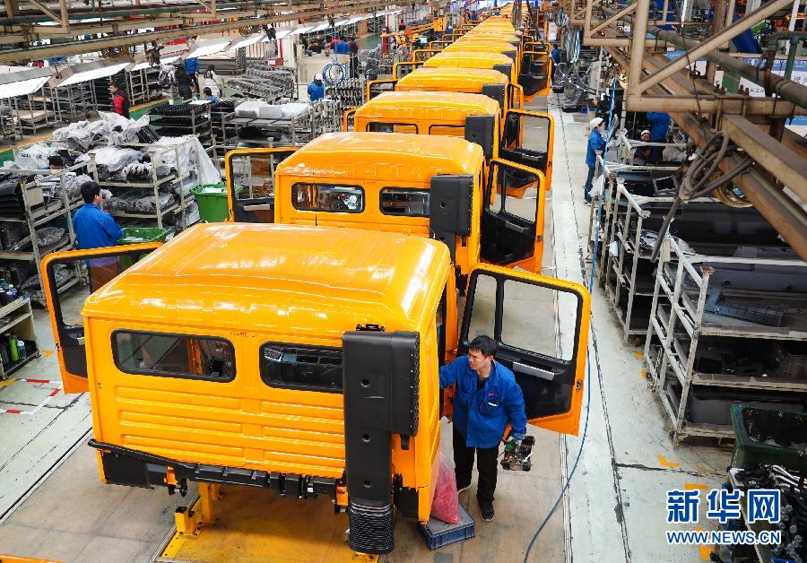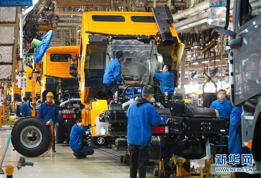 工人在陜汽集團下屬的陜重汽汽車總裝配廠車間流水線上作業(yè)(1月17日攝)。 新華社記者 邵瑞 攝