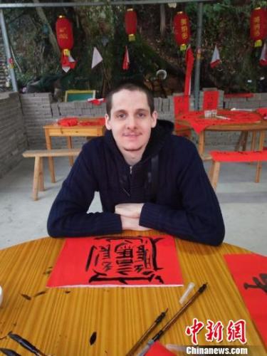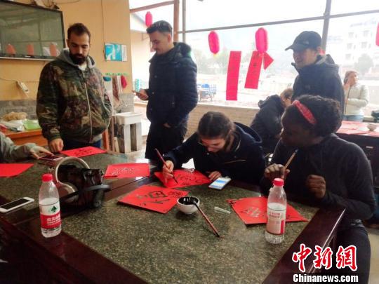 外國(guó)游客學(xué)寫春聯(lián) 武義提供