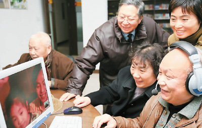 家住杭州的張淼林夫婦通過網(wǎng)絡(luò)視頻和美國(guó)的兒子一家通話,6歲的孫女在網(wǎng)上給爺爺奶奶拜年。資料圖片