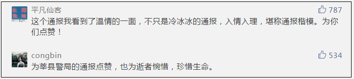 通報發(fā)布后,獲得眾多網(wǎng)友點贊。昨日(10日),記者從撰寫通報的莘縣公安局宣傳科室了解到,“另類”行文是“希望大家看到通報能夠體諒他家人的感受,不再傳播血腥視頻,不再惡意揣測死因”。