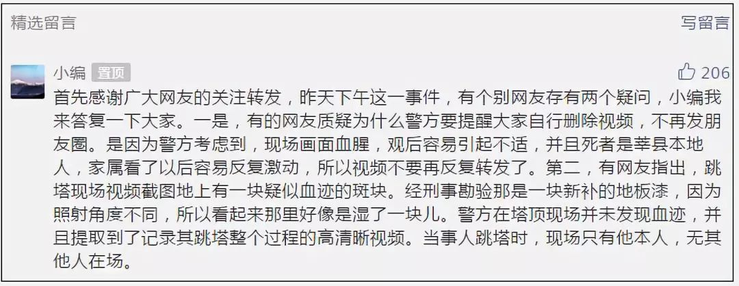 “我們就在通報的基礎上,通過留言進行了辟謠和提醒?!本奖硎荆痛耸掠袀€別網(wǎng)友存有兩個疑問:一是,質疑為什么警方要提醒大家自行刪除視頻。警方解釋,現(xiàn)場畫面血腥,觀后容易引起不適,并且死者是莘縣本地人,家屬看了以后容易反復激動。二是,網(wǎng)友指出,跳塔現(xiàn)場視頻截圖地上有一塊疑似血跡的斑塊。經(jīng)刑事勘驗那是一塊新補的地板漆,因照射角度不同,所以看起來那里好像是濕了一塊兒。警方在現(xiàn)場并未發(fā)現(xiàn)血跡,此外,當事人跳塔時,現(xiàn)場只有他本人。