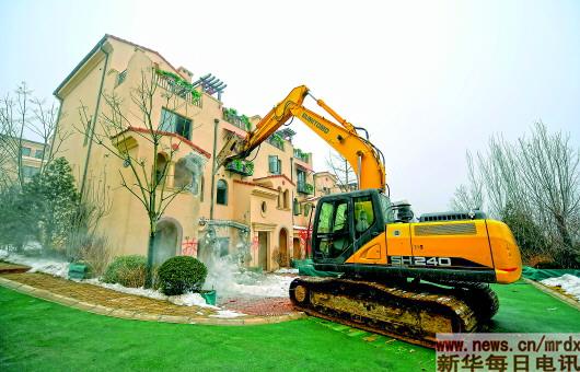 ▲2月19日,大型機械在拆除石家莊市鹿泉區(qū)“西美金山湖”房地產(chǎn)項目違規(guī)別墅。本報記者王曉攝