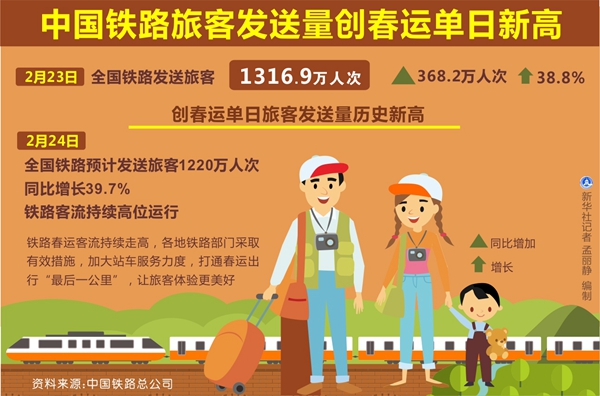 新華社北京2月24日電(記者樊曦)記者從中國鐵路總公司獲悉,2月23日,全國鐵路發(fā)送旅客1316.9萬人次,同比增加368.2萬人次,增長38.8%,創(chuàng)春運(yùn)單日旅客發(fā)送量歷史新高。