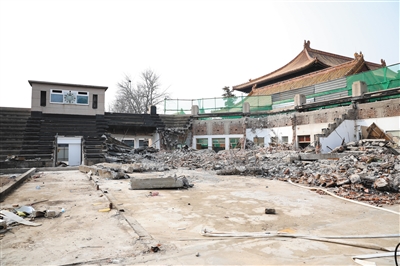 太廟曾是明清兩代皇帝祭奠祖先的家廟,因維護管理需要,曾在上世紀五六十年代建設過一些臨時建筑物,其中就有一處占地1600余平方米的廢棄看臺及附屬建筑物,由于歷史原因一直沒有將其拆除。經多方協調,3月20日上午東城城管東華門街道執(zhí)法一隊開始對該處有將近60年的“臨建”進行了拆除。