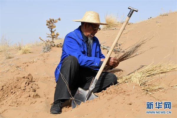 在甘肅省古浪縣境內的黑崗沙風沙口,八步沙第二代治沙人用稻草壓沙(3月26日攝)。新華社記者 范培珅 攝