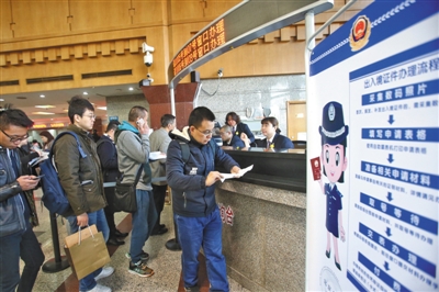 昨日,北京市公安局出入境接待大廳,居民排隊領號辦理出入境證件。記者 王貴彬 攝