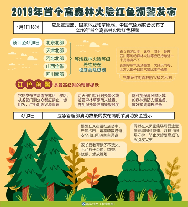 “此次紅色預(yù)警是三部門綜合考慮氣象條件、林區(qū)物候及衛(wèi)星林火監(jiān)測(cè)、清明節(jié)期間祭掃影響等情況,經(jīng)過(guò)會(huì)商研判共同發(fā)布的。”中國(guó)氣象局公共氣象服務(wù)中心副首席楊曉丹說(shuō),自3月初以來(lái),北京、河北、陜西、四川等地的森林火險(xiǎn)等級(jí)一直居高不下,已持續(xù)近一個(gè)月;近期冷空氣活動(dòng)頻發(fā)、大風(fēng)天氣多,北方大部分地區(qū)氣溫比往年偏高,氣象條件對(duì)森林防火極為不利。