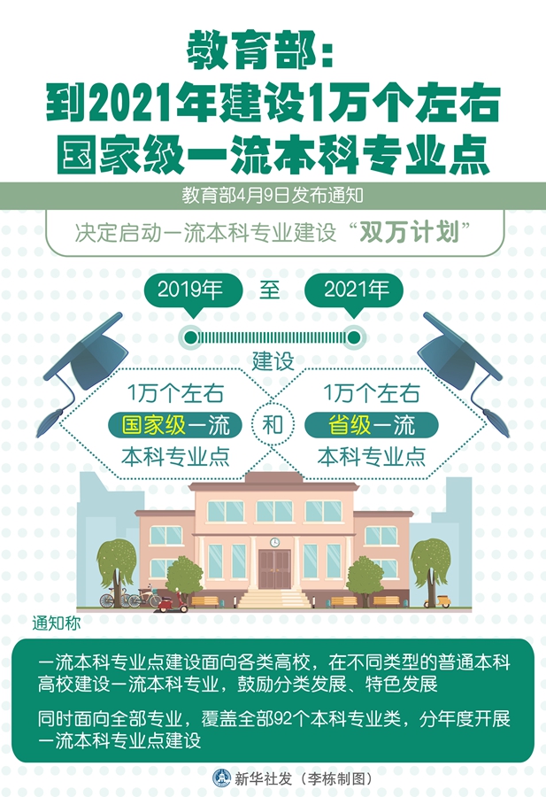 新華社北京4月9日電(記者施雨岑)教育部9日發(fā)布通知,決定啟動一流本科專業(yè)建設(shè)“雙萬計(jì)劃”,2019年至2021年建設(shè)1萬個左右國家級一流本科專業(yè)點(diǎn)和1萬個左右省級一流本科專業(yè)點(diǎn)。