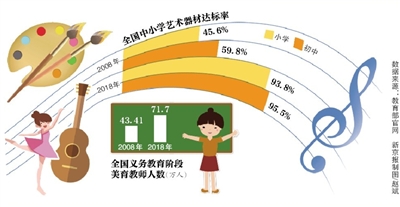根據(jù)教育部公布的最新數(shù)據(jù),2018年全國小學藝術(shù)器材達標率提高到93.8%,初中提高到95.5%;2018年全國義務(wù)教育階段美育教師人數(shù)增加到71.7萬人。比10年前有較大幅度提高。