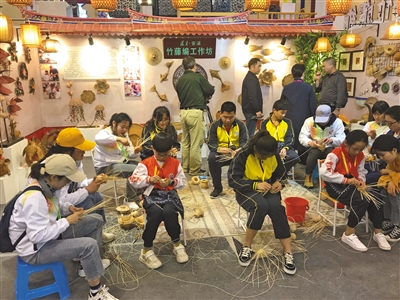 學生藝術(shù)實踐工作坊,來自福建安溪的小學生展示竹藤編。新京報記者 馮琪 攝