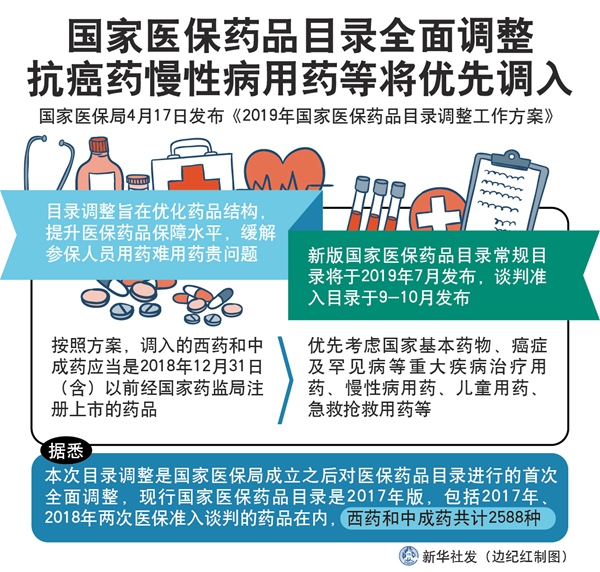 新華社北京4月18日電(記者張泉)國家醫(yī)保局17日發(fā)布《2019年國家醫(yī)保藥品目錄調整工作方案》,目錄調整旨在優(yōu)化藥品結構,提升醫(yī)保藥品保障水平,緩解參保人員用藥難用藥貴問題。新版國家醫(yī)保藥品目錄常規(guī)目錄將于今年7月發(fā)布,談判準入目錄于9-10月發(fā)布。