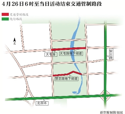 4月23日0時至4月26日活動結束,由北辰西路與大屯路交叉口(不含)經大屯路、天辰西路、大屯北路(不含)、湖景東路、國家體育場北路、景觀大道、慧忠路、天辰西路至大屯路以內區(qū)域道路,除持有“高峰論壇”專用證件的車輛外,禁止其他車輛通行。
