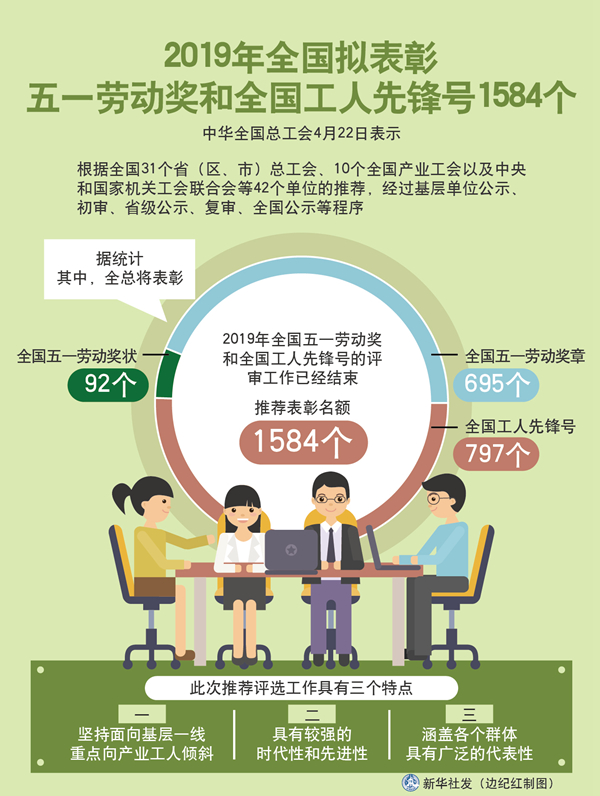 據(jù)統(tǒng)計(jì),其中全總將表彰全國(guó)五一勞動(dòng)獎(jiǎng)狀92個(gè)、全國(guó)五一勞動(dòng)獎(jiǎng)?wù)?95個(gè)、全國(guó)工人先鋒號(hào)797個(gè)。