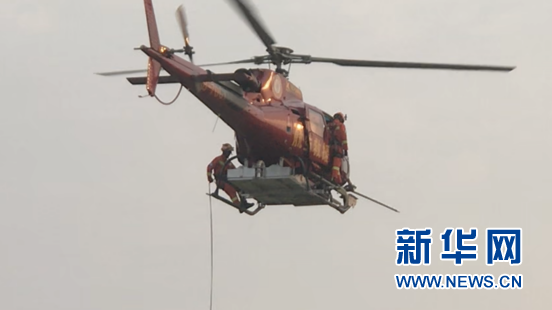 直升機到達傷者受困地點,下降至距離傷者所在地面50米的位置開始懸停,消防員唐運德攜帶救援設(shè)備,依靠一根繩索,進行了垂直速降。