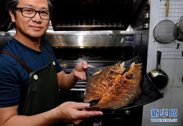 臺(tái)北市“一品言”餐館老板兼大廚劉添吉在展示烤魚(4月24日攝)。新華社記者 張國俊 攝