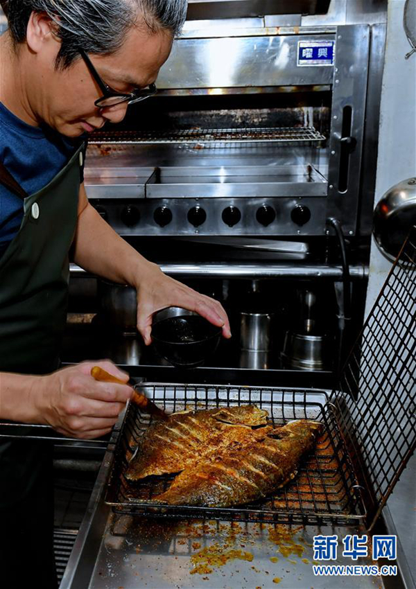 臺(tái)北市“一品言”餐館老板兼大廚劉添吉在加工烤魚(4月24日攝)。新華社記者 張國俊 攝