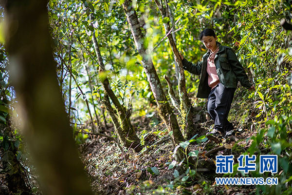 云南貢山縣獨(dú)龍江鄉(xiāng)巴坡村森林資源管護(hù)隊(duì)小隊(duì)長(zhǎng)木秋云在林間巡護(hù)(4月25日攝)。?新華社記者 江文耀 攝