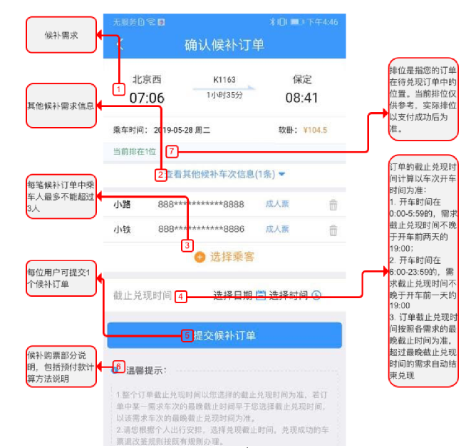 候補(bǔ)購票訂單的提交、兌現(xiàn)時間與網(wǎng)站運(yùn)營時間一致,為每日的6:00至23:00。開車時間在0:00-5:59的,候補(bǔ)終止時間不晚于開車前兩天的19:00;開車時間在6:00-23:59的,候補(bǔ)終止時間不晚于開車前一天的19:00。