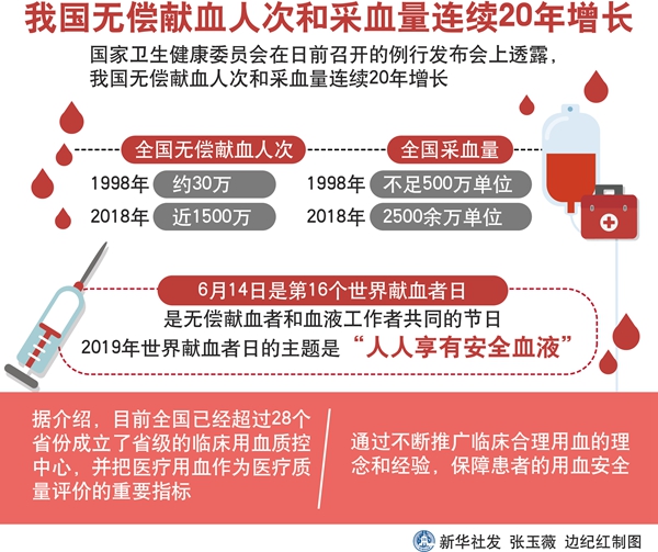 新華社北京6月11日電(記者屈婷)國家衛(wèi)生健康委員會在日前召開的例行發(fā)布會上透露,我國無償獻血人次和采血量連續(xù)20年增長,2018年無償獻血人次接近1500萬,采血量達到了2500萬單位。