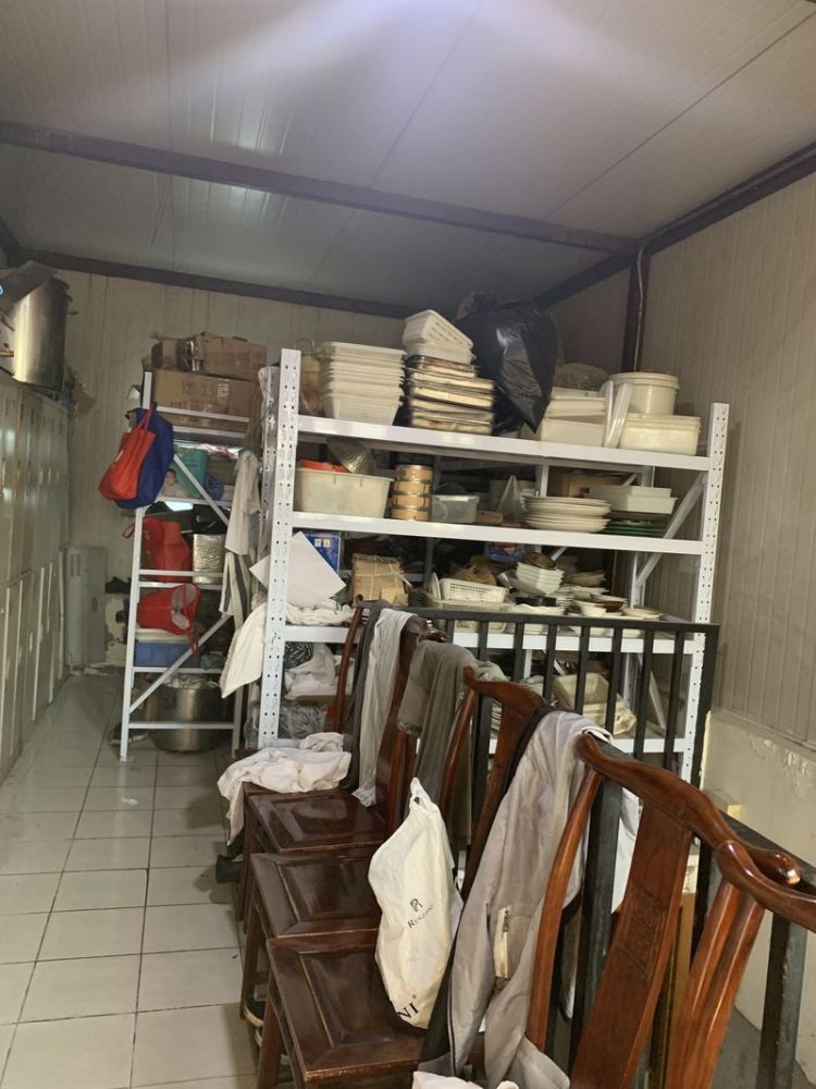 致美齋三樓餐具倉庫同時(shí)為員工更衣室,餐具與員工衣物堆放在一起。圖片來源:新華社客戶端