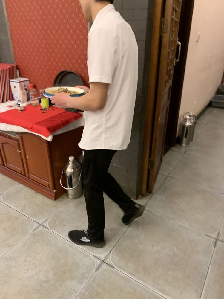 傳菜員端菜時(shí)未使用托盤。圖片來源:新華社客戶端