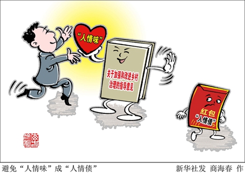 近日,中辦、國(guó)辦印發(fā)《關(guān)于加強(qiáng)和改進(jìn)鄉(xiāng)村治理的指導(dǎo)意見(jiàn)》。意見(jiàn)提出,全面推行移風(fēng)易俗,整治農(nóng)村婚喪大操大辦、高額彩禮、鋪張浪費(fèi)、厚葬薄養(yǎng)等不良習(xí)俗。依靠群眾因地制宜制定村規(guī)民約,提倡把喜事新辦、喪事簡(jiǎn)辦、弘揚(yáng)孝道、尊老愛(ài)幼、扶殘助殘、和諧敦睦等內(nèi)容納入村規(guī)民約。