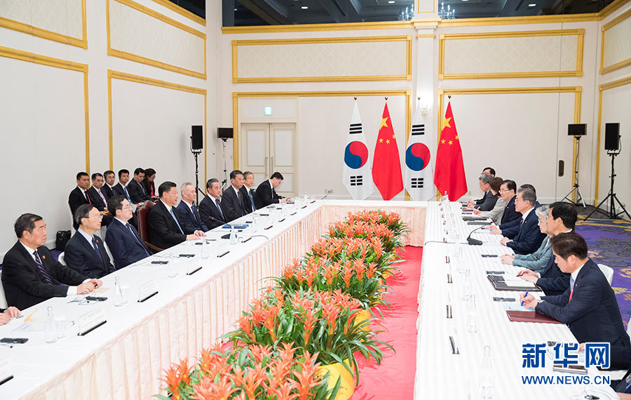 6月27日,國(guó)家主席習(xí)近平在日本大阪會(huì)見韓國(guó)總統(tǒng)文在寅。 新華社記者 黃敬文 攝