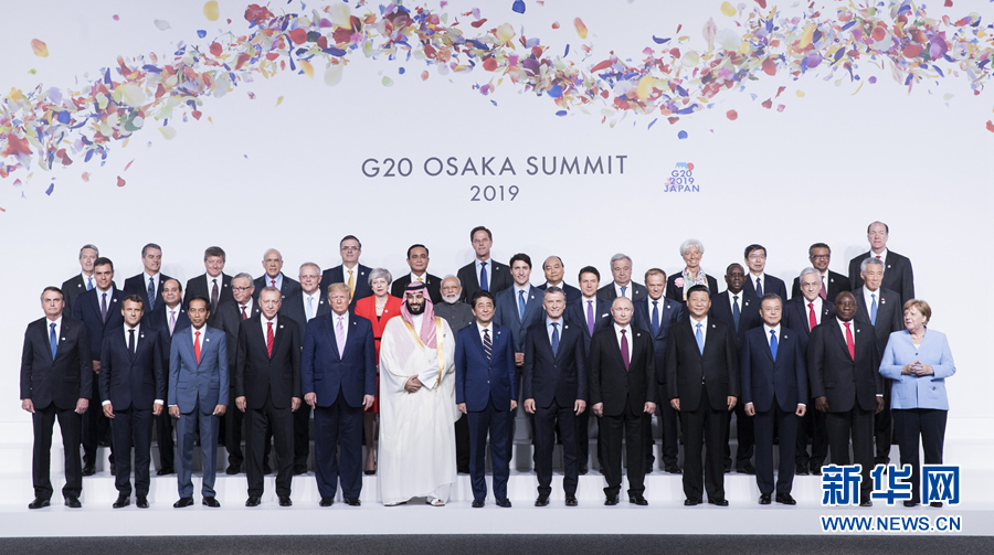 6月28日,二十國集團領(lǐng)導(dǎo)人第十四次峰會在日本大阪舉行。國家主席習(xí)近平出席并發(fā)表題為《攜手共進(jìn),合力打造高質(zhì)量世界經(jīng)濟》的重要講話。這是習(xí)近平同其他與會領(lǐng)導(dǎo)人合影。新華社記者 黃敬文 攝