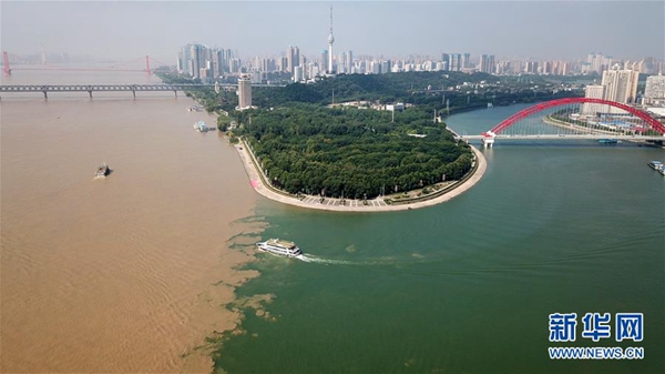 船只從漢江(右側(cè))駛?cè)腴L(zhǎng)江(左側(cè))水域(7月15日無(wú)人機(jī)拍攝)。新華社記者 程敏 攝