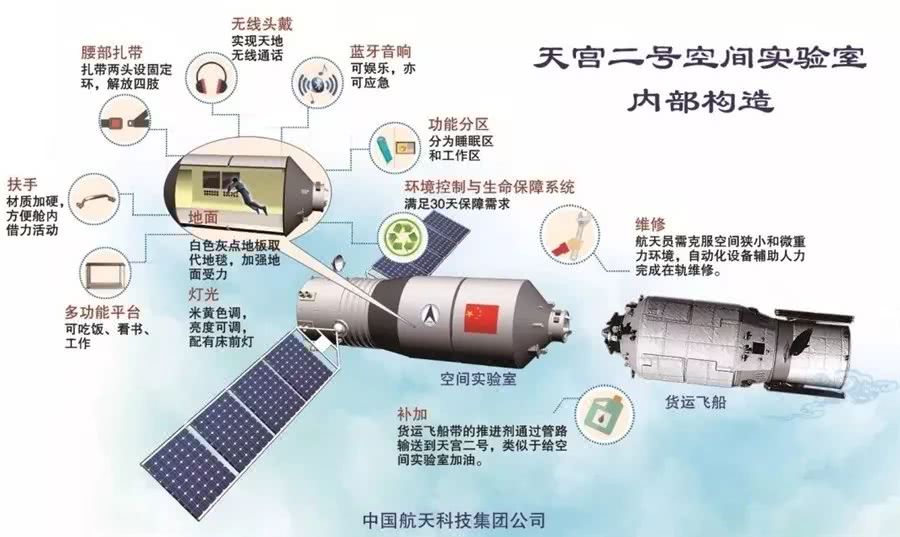 天宮二號空間實(shí)驗(yàn)室內(nèi)部構(gòu)造(來源:中國航天科技集團(tuán)微信公眾號)