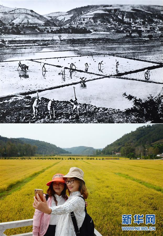 這是一張拼版照片,上圖為抗戰(zhàn)時期延安南泥灣的生產(chǎn)場景(資料圖片);下圖為2018年9月12日,游客在延安南泥灣稻田旁留影(新華社記者劉瀟攝)。新華社發(fā)