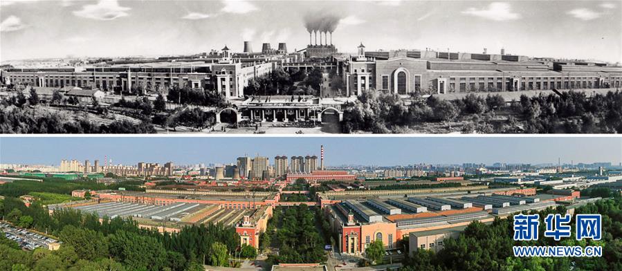 拼版照片:上圖為20世紀(jì)50年代的第一汽車(chē)制造廠廠區(qū)(資料圖片);下圖為2019年6月12日無(wú)人機(jī)拍攝的一汽廠區(qū)全景(新華社記者 許暢 攝)。新華社發(fā)