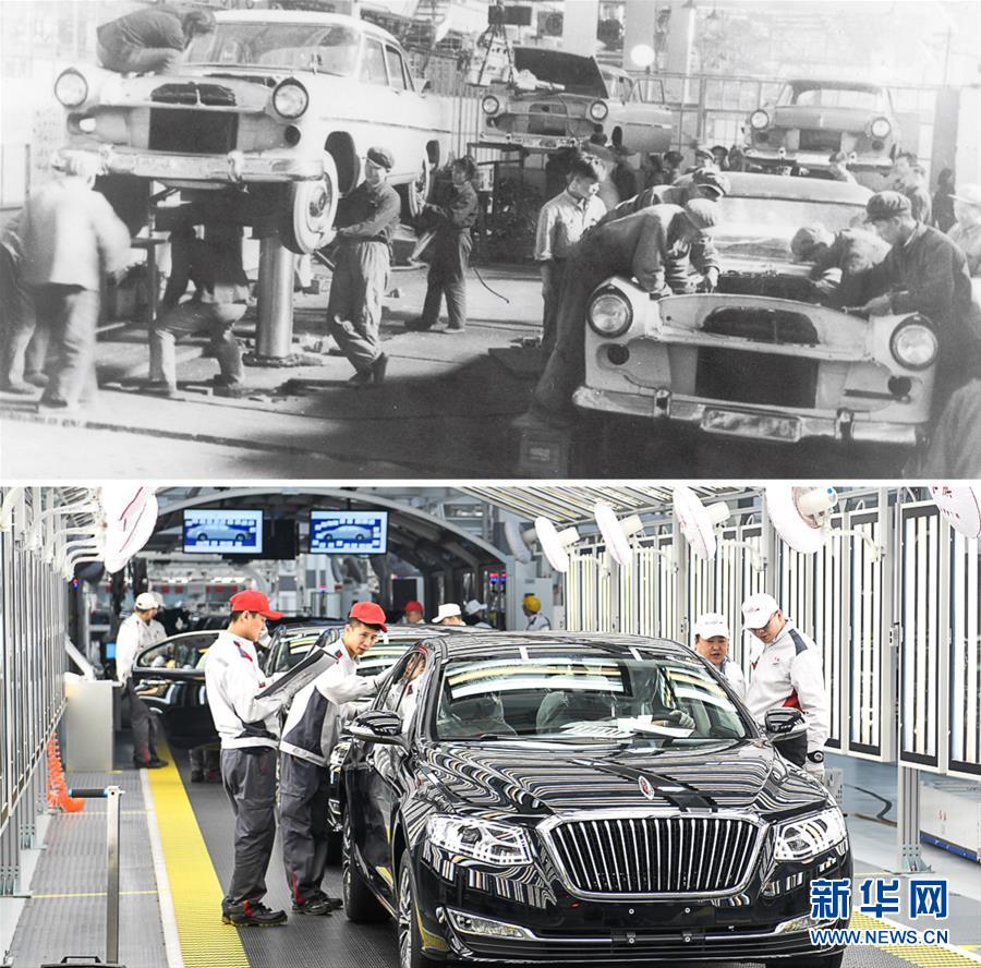 拼版照片:上圖為20世紀(jì)50年代拍攝的第一批紅旗轎車(chē)生產(chǎn)線(資料照片);下圖為在一汽紅旗總裝車(chē)間內(nèi),一汽紅旗職工在對(duì)生產(chǎn)的紅旗轎車(chē)進(jìn)行靜檢作業(yè)(新華社記者許暢2019年4月9日攝)。新華社發(fā)