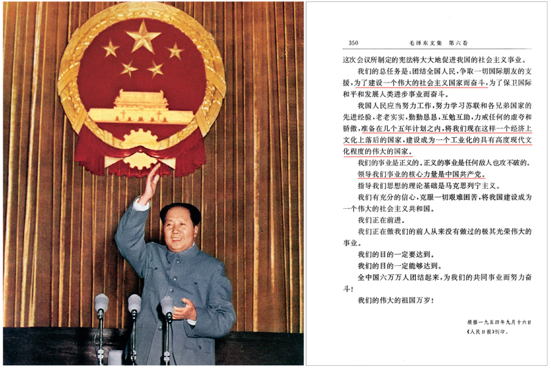 毛澤東同志在1954年第一屆全國(guó)人民代表大會(huì)第一次全體會(huì)議致開幕詞時(shí)宣布:準(zhǔn)備在幾個(gè)五年計(jì)劃之內(nèi),將我國(guó)“建設(shè)成為一個(gè)工業(yè)化的具有高度現(xiàn)代文化程度的偉大的國(guó)家”,強(qiáng)調(diào)“領(lǐng)導(dǎo)我們事業(yè)的核心力量是中國(guó)共產(chǎn)黨”。左圖為毛澤東同志在第一屆全國(guó)人大第一次會(huì)議上致開幕詞;右圖為毛澤東同志在開幕詞中的重要論述。