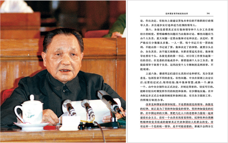 鄧小平同志高度重視堅(jiān)持和加強(qiáng)黨的領(lǐng)導(dǎo),旗幟鮮明地指出中國(guó)共產(chǎn)黨是社會(huì)主義現(xiàn)代化事業(yè)的領(lǐng)導(dǎo)核心,在改革開放和現(xiàn)代化建設(shè)中,必須始終堅(jiān)持黨的領(lǐng)導(dǎo),加強(qiáng)和改進(jìn)黨的建設(shè)。左圖為鄧小平同志在中國(guó)共產(chǎn)黨第十二次全國(guó)代表大會(huì)上致開幕詞(新華社記者 錢嗣杰/攝);右圖為鄧小平同志有關(guān)堅(jiān)持和加強(qiáng)黨的領(lǐng)導(dǎo)的重要論述。