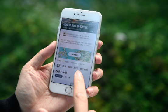 ↑2019年3月19日,游客使用手機(jī)體驗(yàn)“西湖一鍵智慧游”服務(wù),可實(shí)現(xiàn)一鍵導(dǎo)航、一鍵導(dǎo)覽、一鍵導(dǎo)游。新華社記者 黃宗治 攝